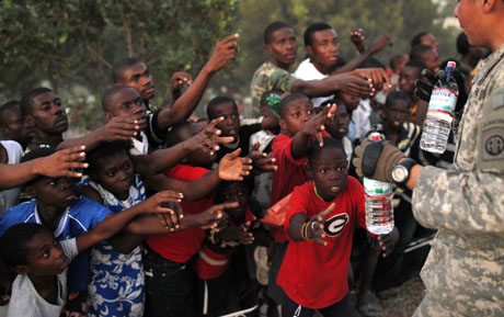 Sobrevivientes del terremoto del martes en Haití intentan obtener agua que entregan soldados estadounidenses en Puerto Príncipe, el domingo 17 de enero de 2010. Foto AP